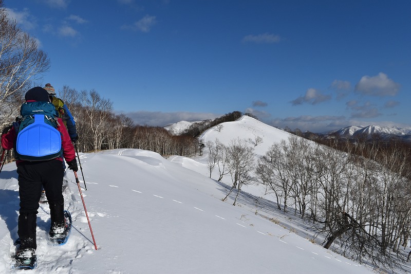 2回の小休憩を挟んで稜線に出ると、西別岳、摩周岳、そして当初予定していた温泉富士も望めました。ダケカンバの林を見ながら一度下り、再び登りきると9時46分、423ピークに到着。山頂からは標津岳や武佐岳も望め、歩いてきたトレースがはっきりと見えました。