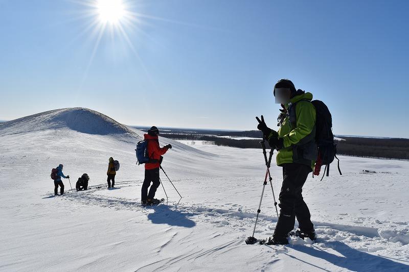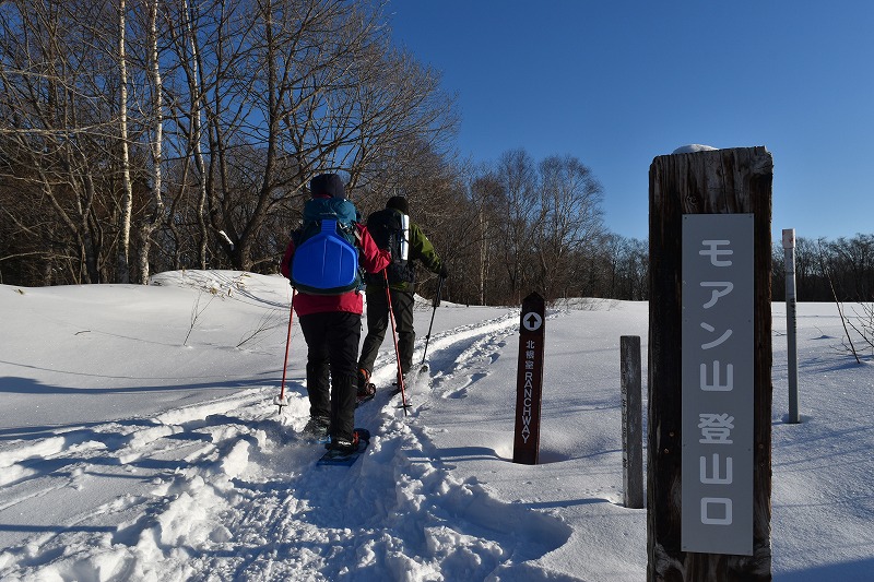 8時15分、モアン山登山口のチェーン着脱場から出発。気温は氷点下15度でしたが、快晴で風もほとんどなく、絶好のスノーシュー日和でした。