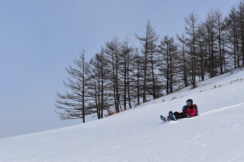 9時55分、モアン山を目指して東へ下ります。かなりの急斜面で、自分は早速尻もち。30分ほど下ったカラマツの植林地で小休憩を取りました。
